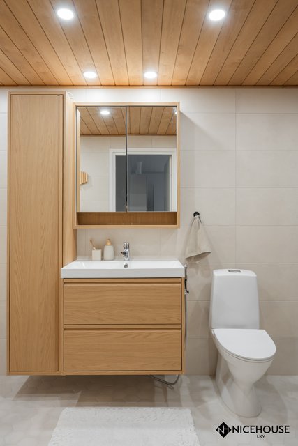 - Tilava kylpyhuone, jossa on myös kodin toinen wc sekä kodinhoitotila. Halutessa kodinhoitotila on mahdollista muuttaa erilliseksi kodinhoitohuoneeksi.