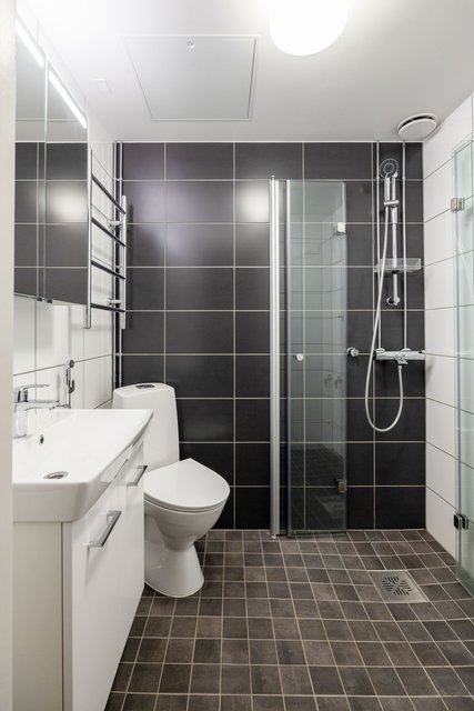 - WC-istuin, suihkuseinä, pesukoneliitäntä, lattialämmitys, pesuallas, peilikaappi, allaskaappi, ja bidee-suihku