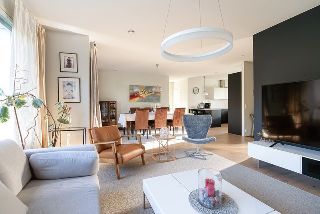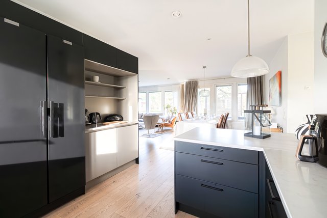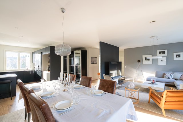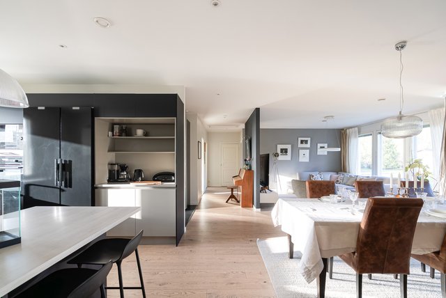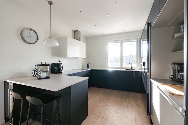 Kodin sydämenä on vuonna 2021 täysin uusittu Novartin A la Carte -keittiö. Tyylikkäässä ja käytännöllisessä keittiössä on laadukkaat AEG:n kodinkoneet, Festivon näyttävä side by side -jääkaappipakastin sekä viinikaappi. Avoin aamiaiskaappi kokoaa kahvikoneen ja arjen tarvikkeet omalle paikalleen ja keittiö avautuu luontevasti suureen ruokailu- ja oleskelutilaan. Tila on todella avara ja suuret ikkunat tuovat sinne runsaasti luonnonvaloa tehden siitä miellyttävän paikan koko perheen elämälle. Kodin pintoja on päivitetty laajasti vuosina 2021–2023 ja keittiö–ruokailu–oleskelutilassa on kaunis Timberwisen lankkuparketti.