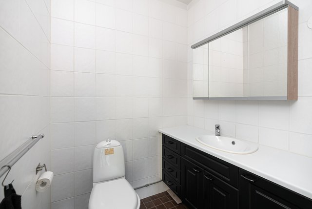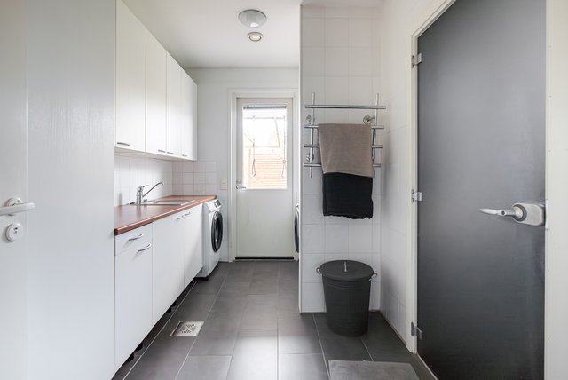 - Pöytätaso, pyykkikaapit, lattiakaivo, pesukoneliitäntä, pesuallas, lattialämmitys, ja pyyhekuivain / seinäpatteri