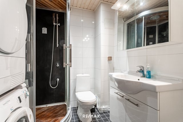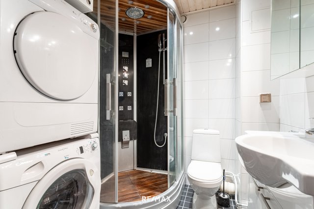 - WC-istuin, suihku, suihkukaappi, pesukone, kuivausrumpu, lattialämmitys, pesuallas, allaskaappi, peilikaappi, bidee-suihku, ja pesukoneliitäntä
