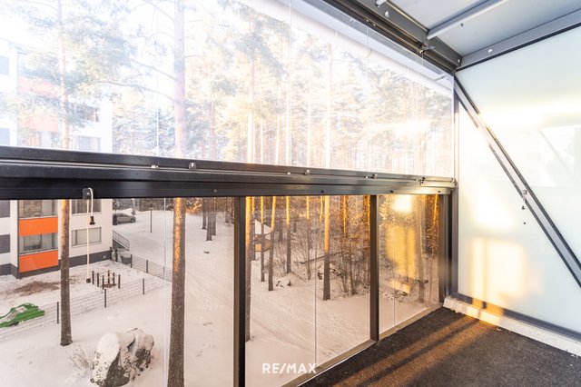 - Tilava olohuone, josta kulku lasitetulle parvekkeelle.