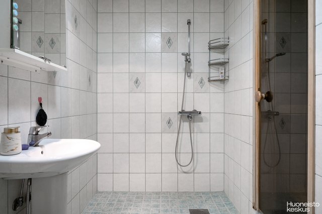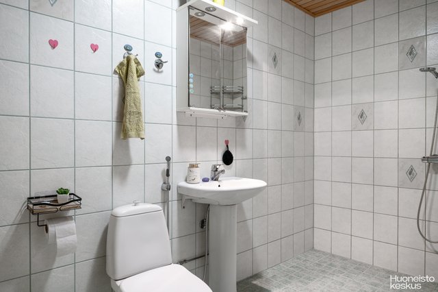 - WC-istuin, suihku, pesukoneliitäntä, lattialämmitys, peilikaappi, pesuallas, allaskaappi, ja bidee-suihku