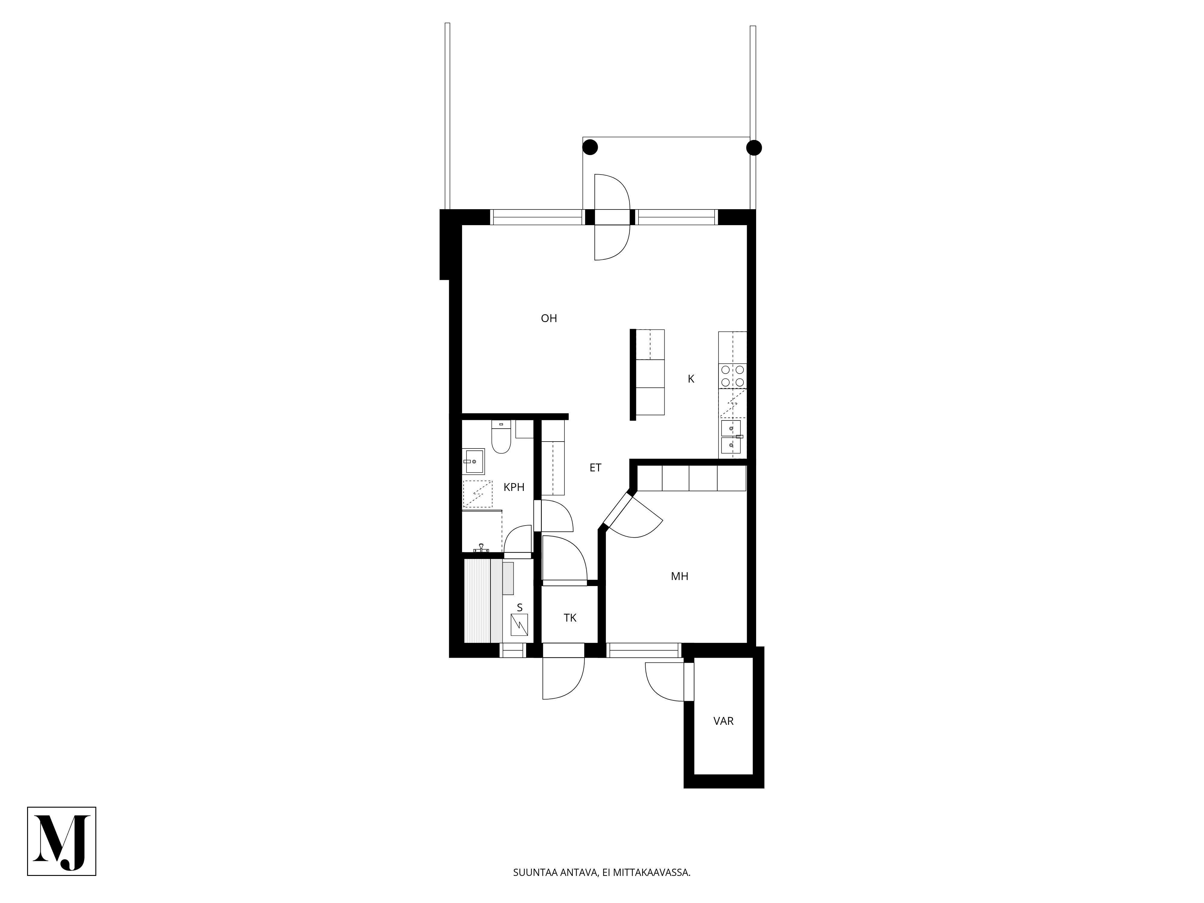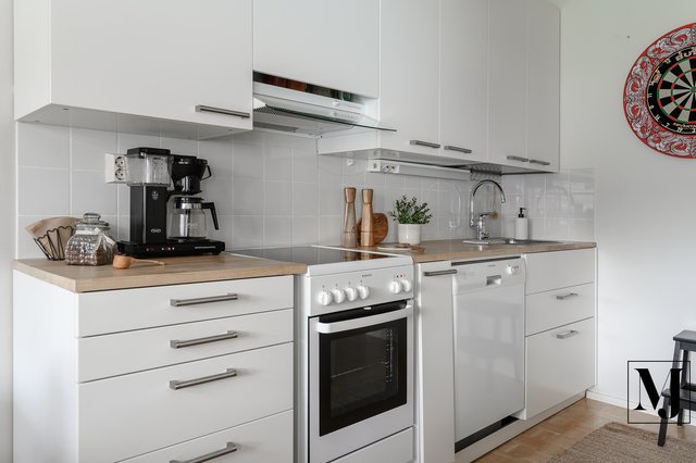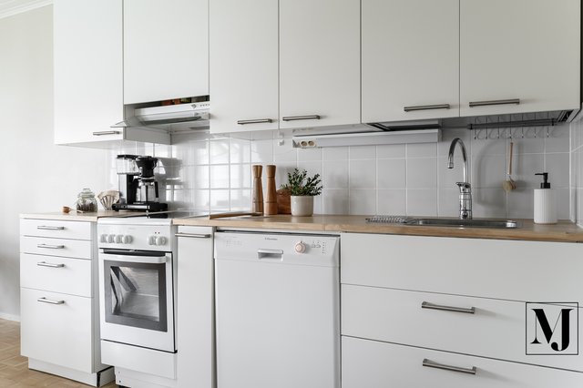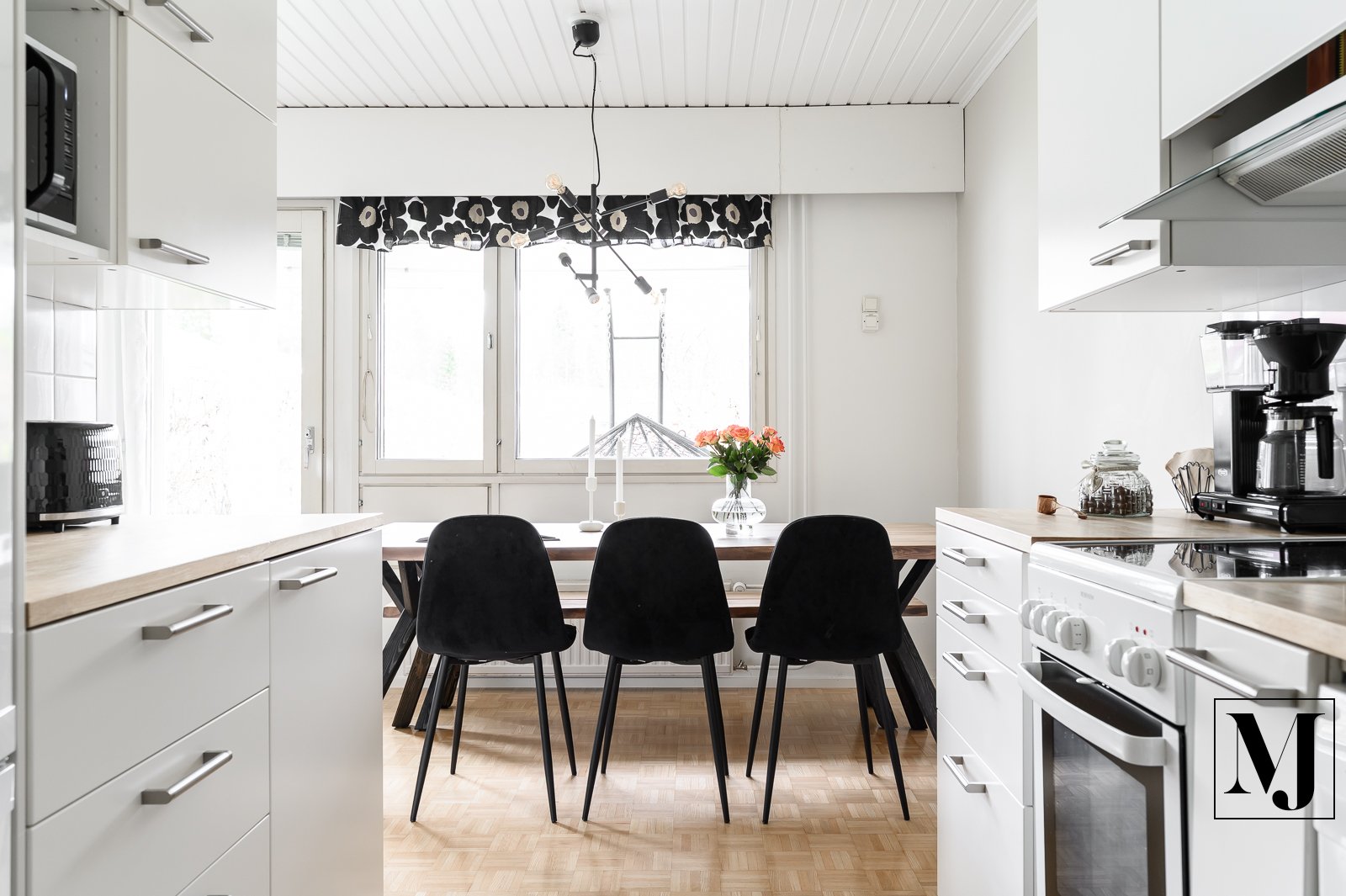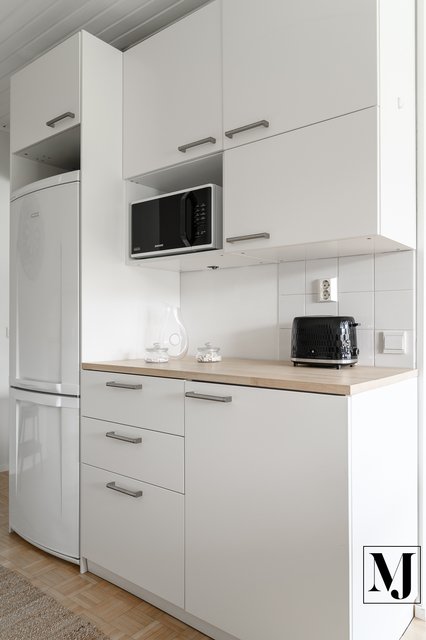 - Vaalea ja tyylikäs I-mallinen keittiö, joka on remontoitu vuonna 2018. Keittiössä on keraaminen liesi uuneineen, astianpesukone sekä jääkaappi-pakastin. Ilmanvaihdosta huolehtii talotuuletin.