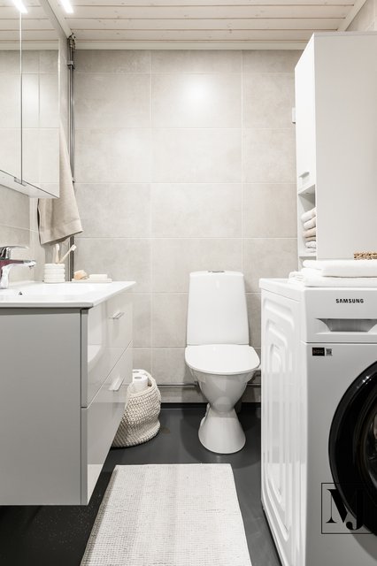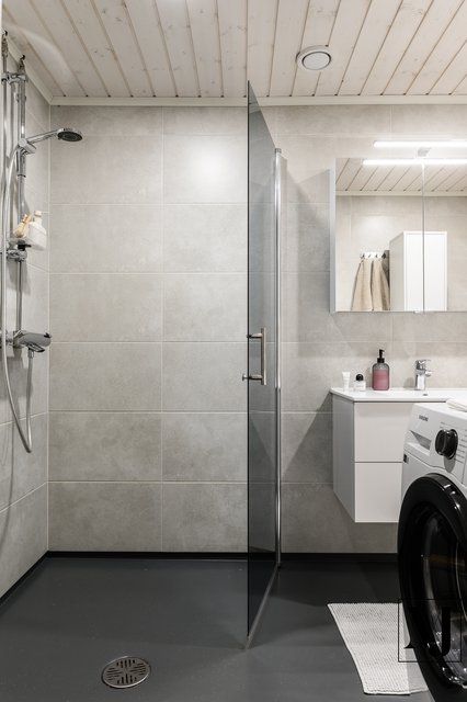 - Kylpyhuone on remontoitu vuonna 2021 jossa modernit ja helppohoitoiset pinnat. Tilava peilikaappi sekä allaskaappi säilytystarpeisiin, wc-istuin ja pesukoneliitäntä. Suihkun yhteydessä on suihkuseinä. Seinät ovat kaakelia ja lattia on pinnoitettu helppohoitoisella epoksilla, mikä tekee tilasta sekä näyttävän että helppohoitoisen.