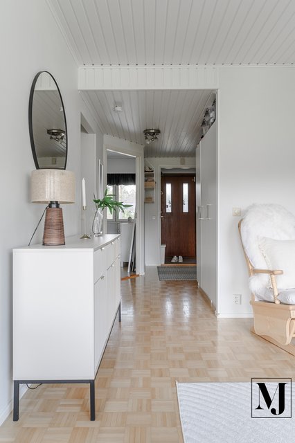 Kylpyhuone on remontoitu vuonna 2021 ja se on toteutettu tyylikkäästi. Epoksipinnoitettu lattia tekee tilasta helppohoitoisen ja kestävän. Kodin alkuperäiset, ajattomat sauvaparkettilattiat tuovat sisustukseen lämpöä ja kodikkuutta.