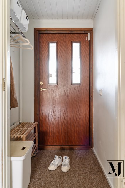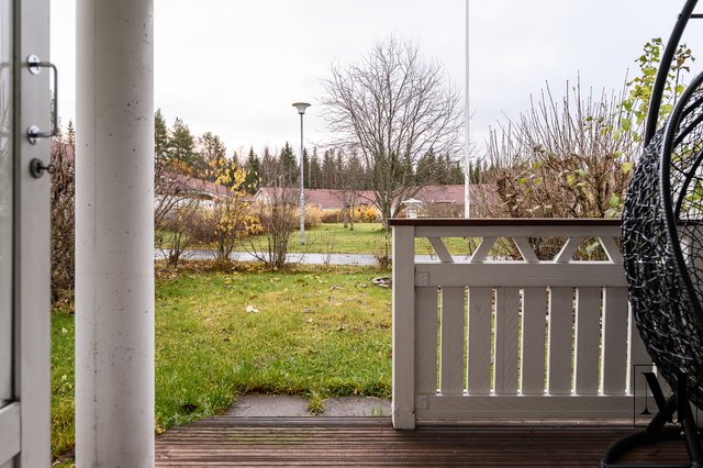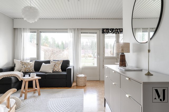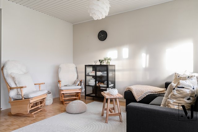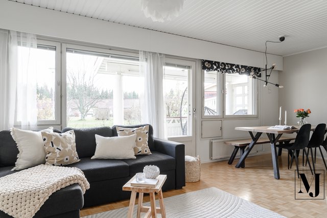 Valoisa ja avara olohuone jatkuu luontevasti ruokailutilan kautta keittiöön, muodostaen yhtenäisen ja toimivan oleskelutilan. Olohuoneesta avautuu kulku omalle etelään suuntautuvalle pihalle, jossa on katettu terassi ja vehreä nurmialue.