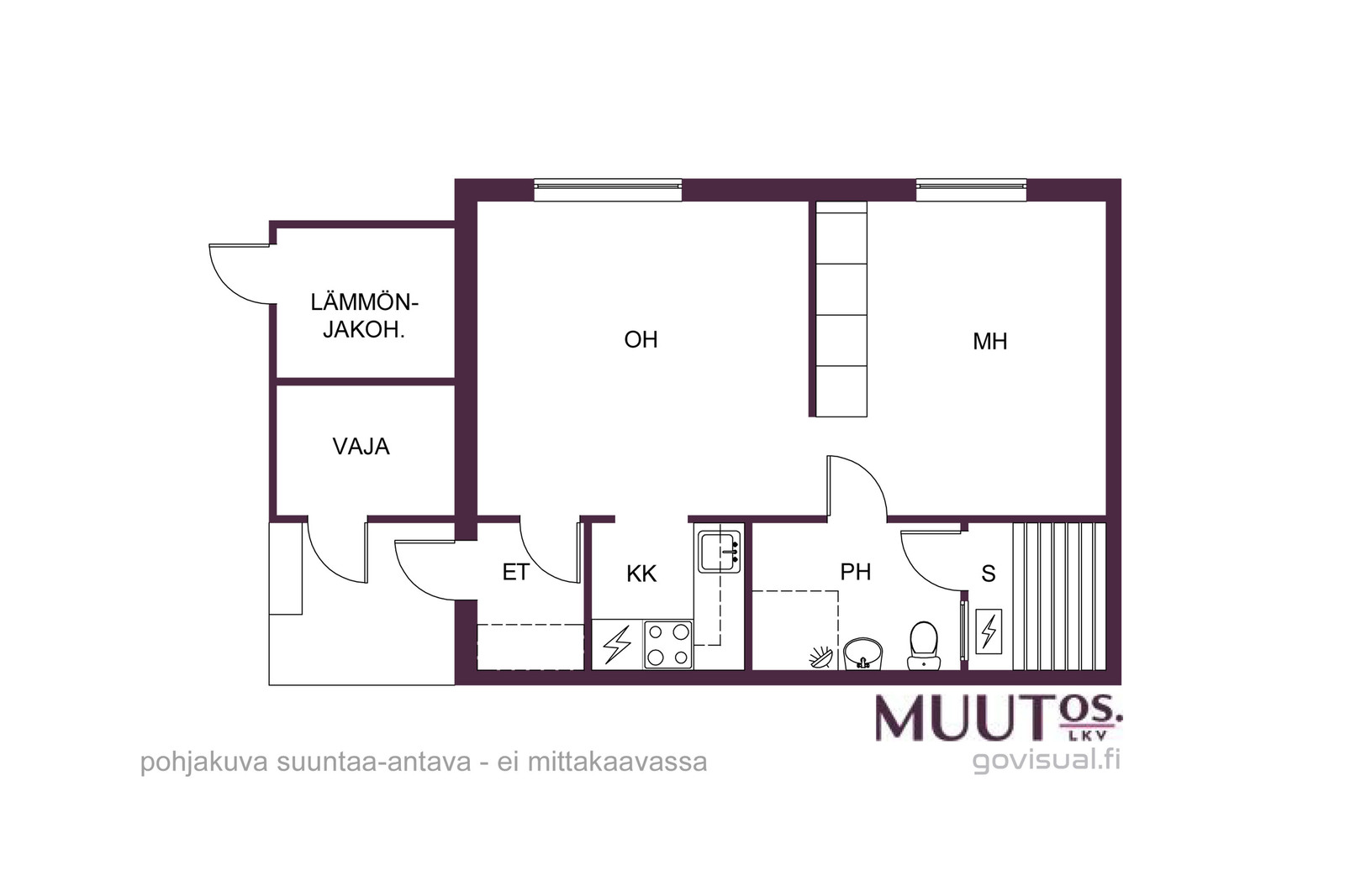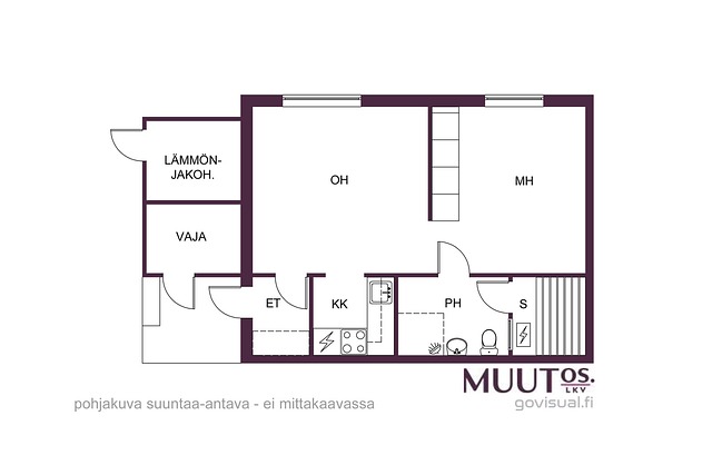 - Edellä mainittu pinta-ala saattaa tämän ikäisessä kohteessa poiketa olennaisestikin huoneiston nykyisen ja rakentamisaikaisen mittaustapojen ja standardien mukaan laskettavasta pinta-alasta. Eri mittaustapojen vuoksi varaston pinta-ala saattaa sisältyä asuintilojen pinta-alaan. Huoneiston todellinen pinta-ala voi olla yhtiöjärjestyksessä, isännöitsijäntodistuksessa ja esitteessä mainittua pienempi tai suurempi. Hinta ei ole pinta-alaperusteinen. Yhtiöjärjestyksen mukainen huoneistoselitelmä: 2h+kk+s+ap