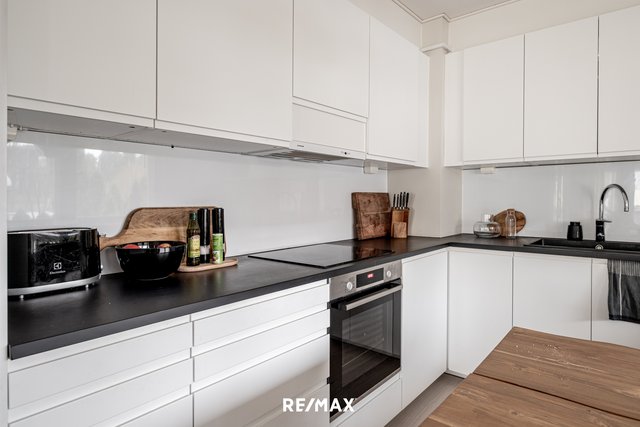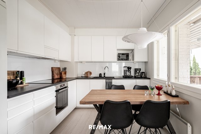 - Varustus: - Jääkaappi / pakastin - Liesi (induktio) - Uuni - Astianpesukone (integroitu) - Kaapistot - Liesituuletin Lattia: laminaatti Seinät: maalattu