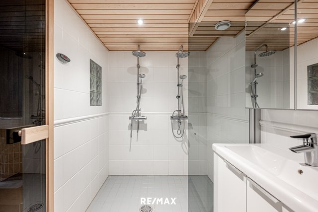 - Varustus: - Tuplasuihkut - Suihkuseinä - Peilikaappi - Allaskaappi Lattia: laatta Seinät: laaatta Pesutilojen laatoitukset ovat alkuperäiset, eli 25- vuotta vanhat.