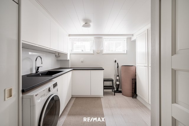 - Kodinhoitohuoneen varustus: - Kaapistot - Pesuallas - Työtaso - Pesukoneliitäntä Lattia: laminaatti Seinät: maalattu