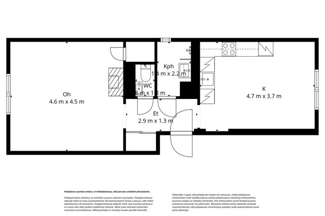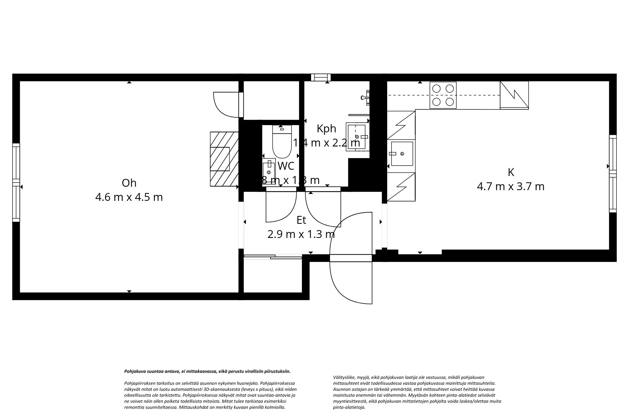 - Ei tarkistusmitattu. Pinta-alat saattavat tämän ikäisissä kohteissa (yhtiö rekisteröity ennen 01.01.1992) poiketa olennaisestikin asuinrakennusten nykyisten mittaustapojen ja standardien (SFS 5139) mukaan laskettavasta asuintilojen pinta-alasta. Pinta-ala voi siis olla edellä mainittua pienempi tai suurempi.