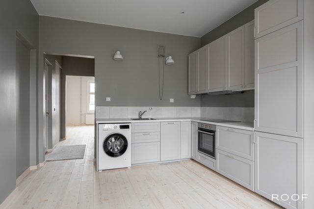 - Vaalea ja toimiva kulmakeittiö, jossa hyvin kaappi ja laskutilaa. Harmaan sävyiset kaapistot, vaalea työtaso ja laattapintainen välitila luovat rauhallisen ja ajattoman ilmeen. Lattiana vaalea lautalattia.