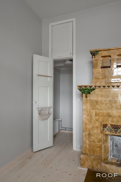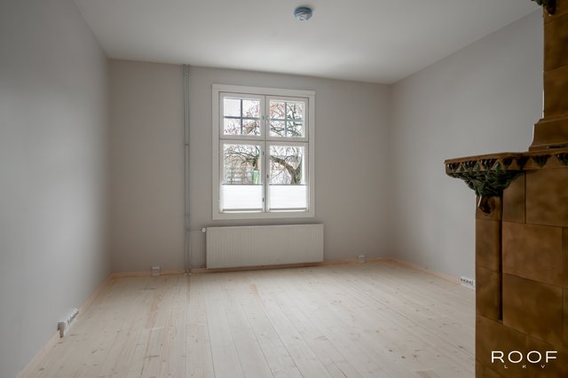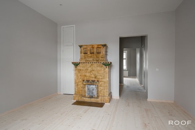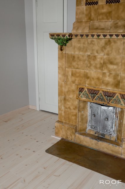 - Valoisa ja tilava olohuone, jossa suuri ikkuna tuo kauniisti luonnonvaloa tilaan. Huoneen katseenvangitsijana toimii upea, koristeellinen takka, joka tuo tilaan persoonallista ilmettä ja vanhan kivitalon tunnelmaa. Takka on kaunis sisustuselementti ja antaa huoneelle selkeän keskipisteen, jonka ympärille on helppo suunnitella kalustus. Tilaan on vaivaton sisustaa sekä oleskelu- että työskentelyalue.