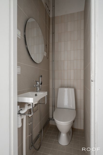 - Erillisestä wc:stä löytyy käsienpesuallas, peili ja wc-istuin käsisuihkulla. Korkea huonekorkeus ja vaaleat pinnat tekevät tiloista avaran ja raikkaan.