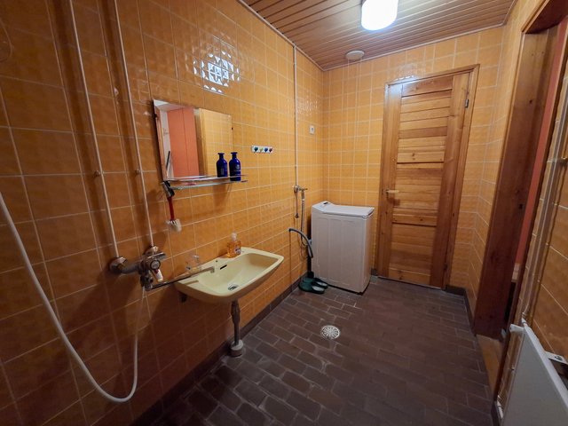 - Kylpyhuoneessa suihku, pesuallas, peili ja pesukoneliitäntä. Pesutilassa alkuperäinen laatoitus. Pesutilojen yhteydessä pukuhuone.