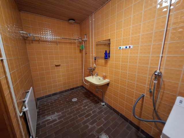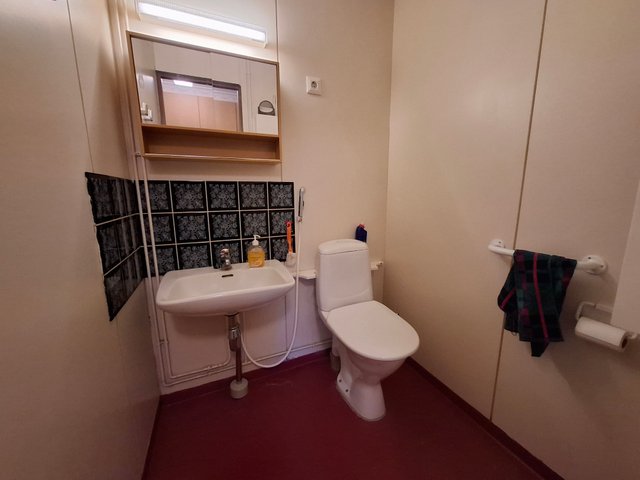 - Varustus: wc-istuin, bidee-suihku, pesuallas ja pelikaappi. Lattiassa muovimatto ja seinät maalattu.