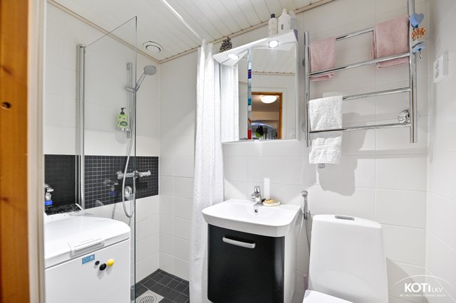 - WC-istuin, suihku, suihkuseinä, pesukoneliitäntä, peilikaappi, pesuallas, ja bidee-suihku