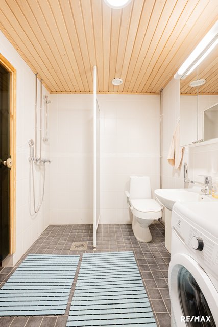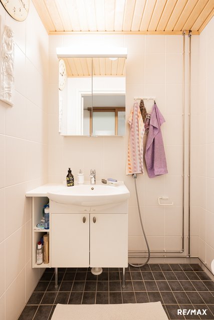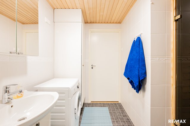 - Kylpyhuoneessa on kaapistot, peilikaappi, allaskaapisto, wc-istuin, suihku, kiinteät valaisimet. Tila pesutornille, pesukoneliitäntä. Seinät ja lattiat on laatoitettu. Tilassa lattialämmitys.
