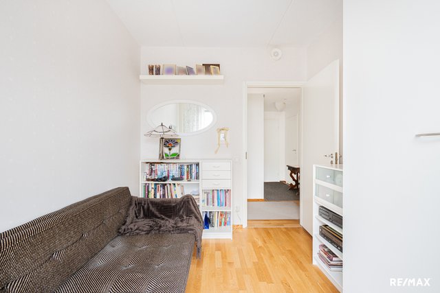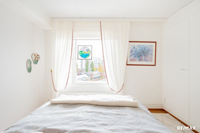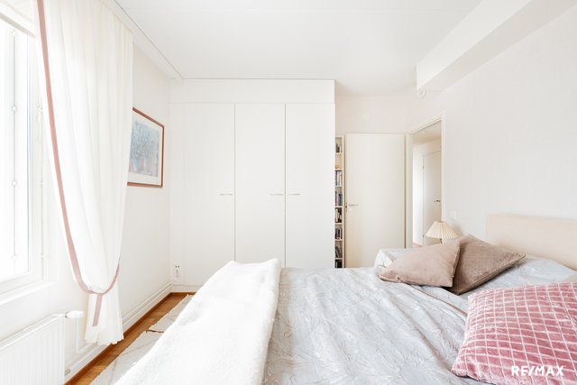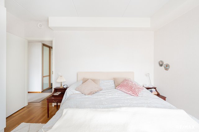 - Makuuhuoneissa on kaapistot vaatesäilytykselle. Seinät on tapetoitu ja lattiat ovat parkettia.