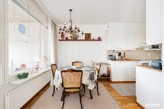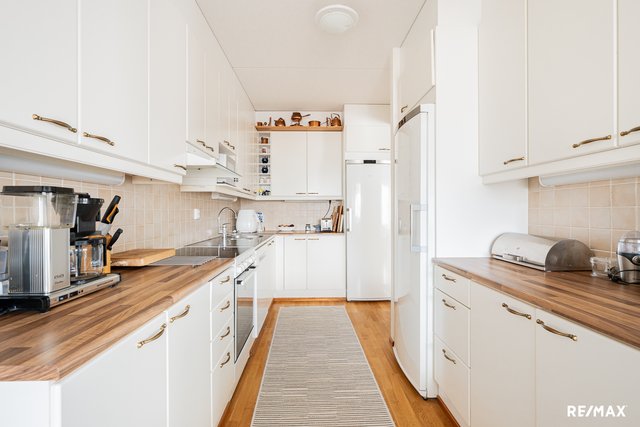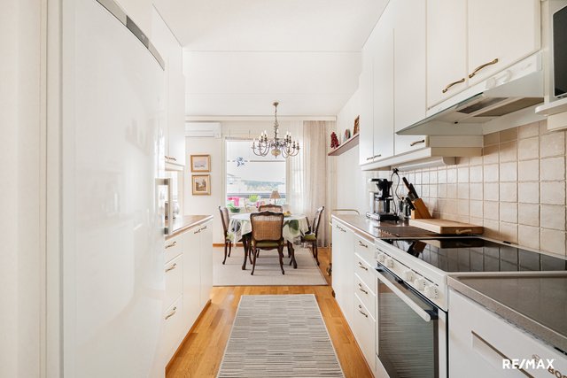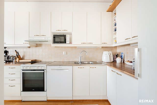 - Vaaleasävyisessä keittiössä on jääkaappi/pakastin, keraaminen liesi, liesituuletin, astianpesukone. Seinät on maali/tapetti ja lattia on parkettia.