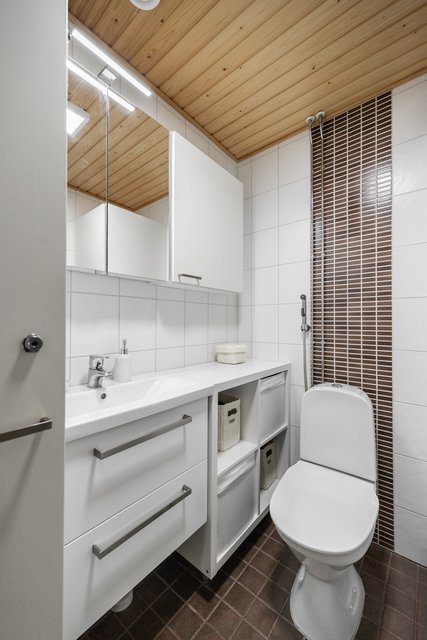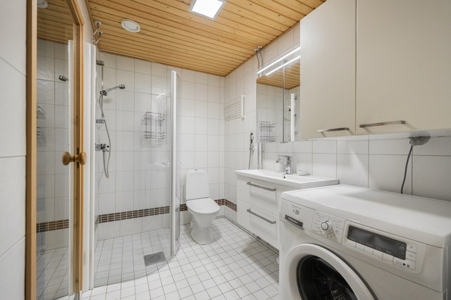 - WC-istuin, suihku, suihkuseinä, peilikaappi, lattialämmitys, pesukoneliitäntä, peili, pesuallas, allaskaappi, ja bidee-suihku