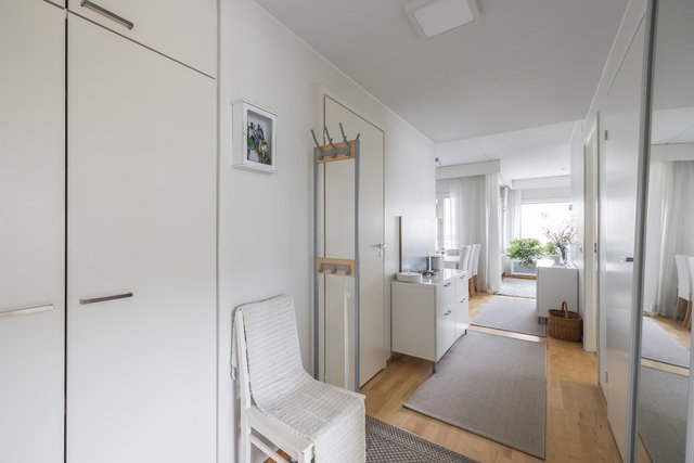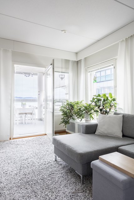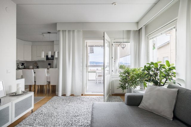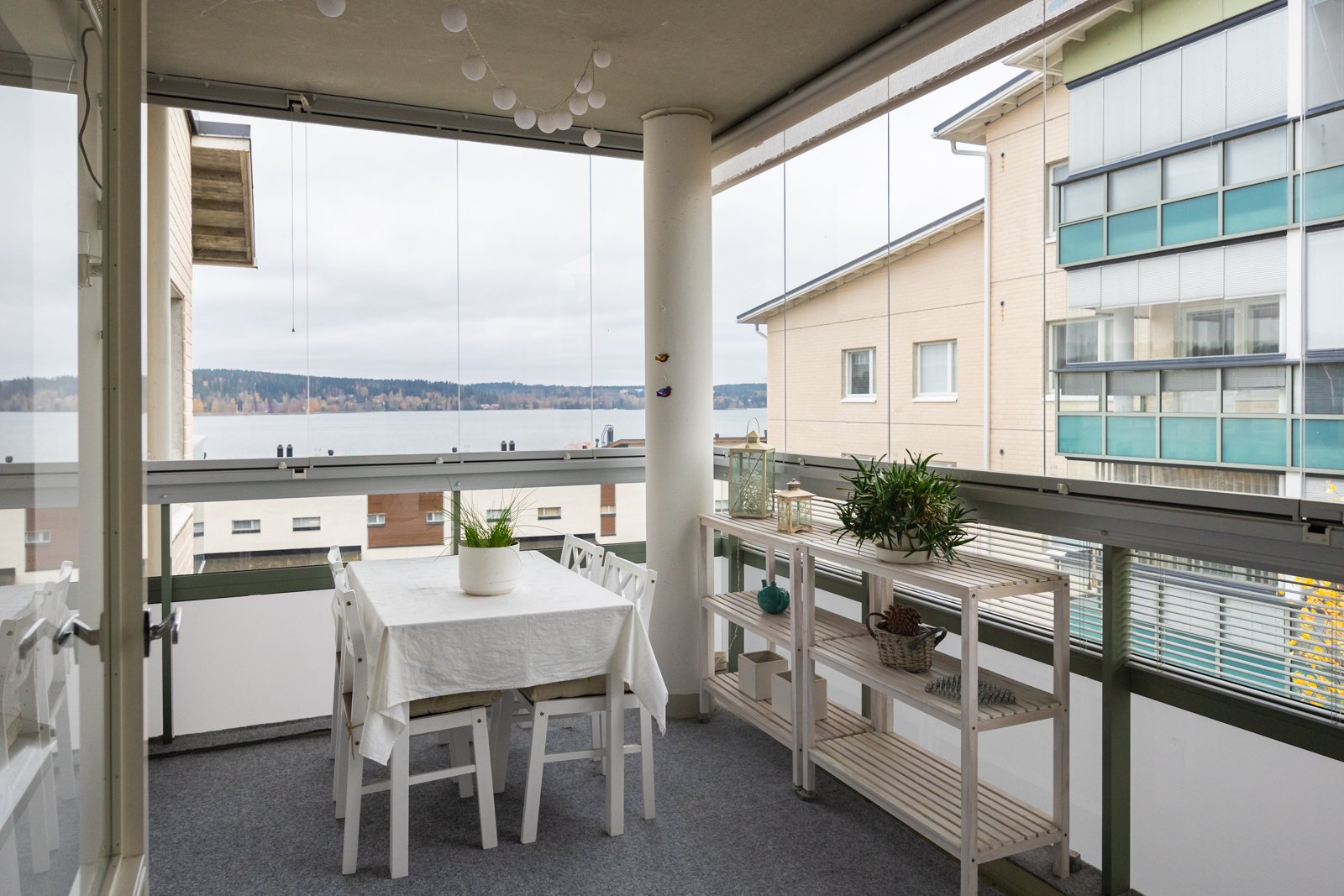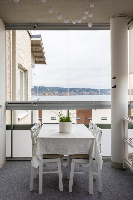 Asunnon helmenä toimii suurehko lasitettu parveke upeilla järvinäkymillä. Täällä kelpaa istua iltaa, juoda aamukahvia ja katsoa kun veneet seikkailevat pitkin Lahden ylpeyttä, Vesijärveä!