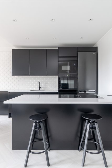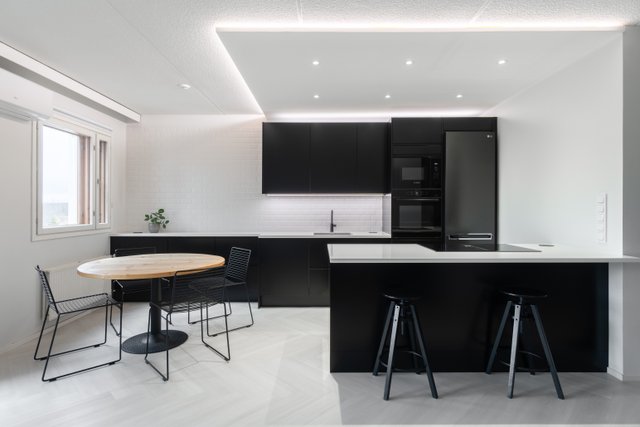 - Jääkaappipakastin (LG), erillisuuni (Bosch pyrolyysi), liesi (induktio), astianpesukone, mikroaaltouuni, intergoitu mikroaaltouuni (Bosch), ja liesituuletin (integroitu)