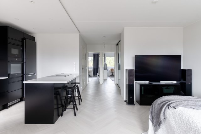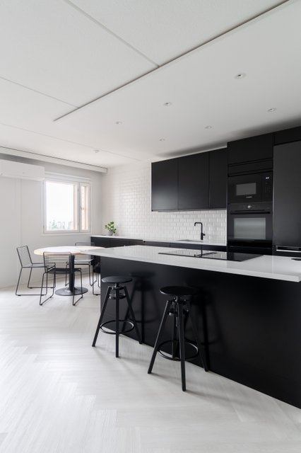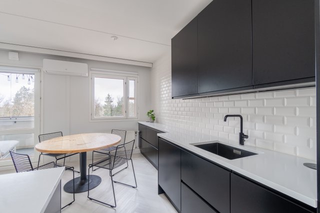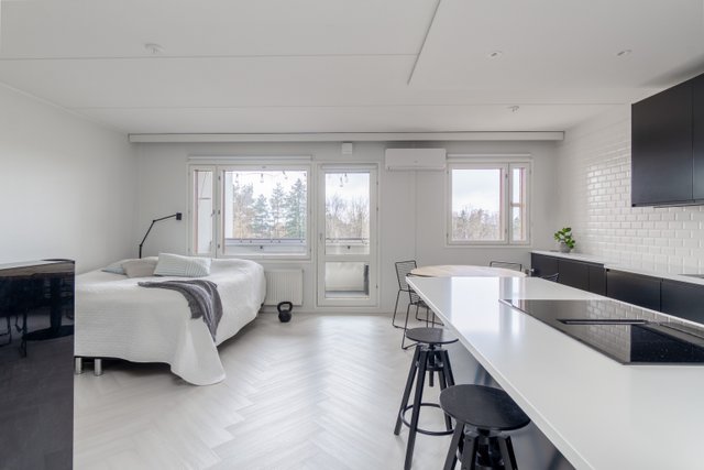 Keittiö on moderni ja hyvin varusteltu, sisältäen muun muassa induktiolieden ja Boschin pyrolyysiuunin. Kylpyhuoneessa on mukavuutta lisäävä lattialämmitys ja erillinen WC tuo arkeen käytännöllisyyttä. Asunnon pinnat ovat siistit ja ajattomat ja säilytystilaa löytyy runsaasti kaapistoista ja häkkivarastosta.