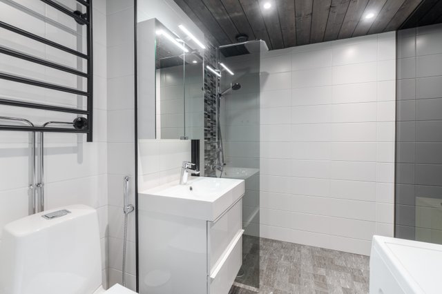 - WC-istuin, suihku, suihkuseinä, pesukoneliitäntä, lattialämmitys, peilikaappi, bidee-suihku, ja allaskaappi