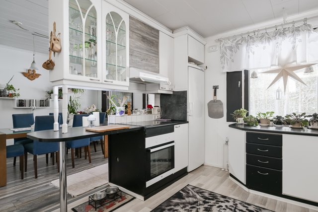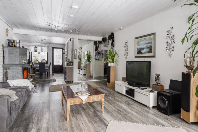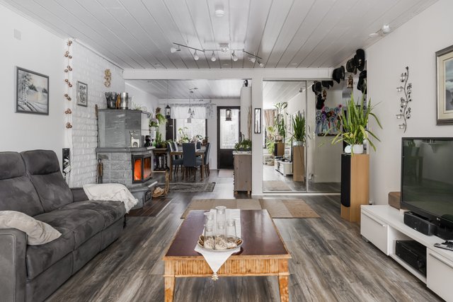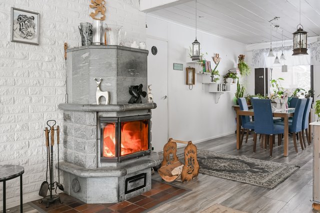 Kodissa on reilusti makuuhuoneita sekä kaksi keittiötä, mikä mahdollistaa esimerkiksi itsenäisen asumisen talon toisessa päässä – erinomainen ratkaisu teinille tai vaikkapa isovanhemmalle. Talon molemmissa päistä löytyy tunnelmalliset ja lämpöä tuottavat takat, jotka tuo lämpöä ja kodikkuutta tähän kotiin.