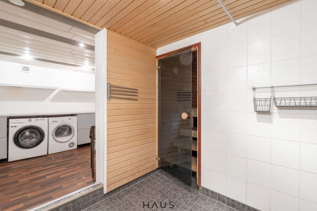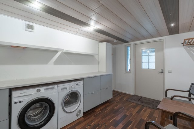- Pesukoneliitäntä, tila pesutornille, pesuallas, ja laatikosto