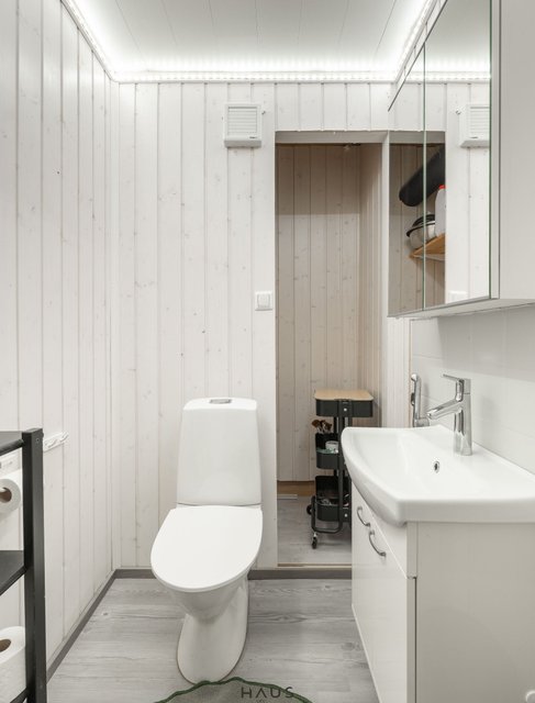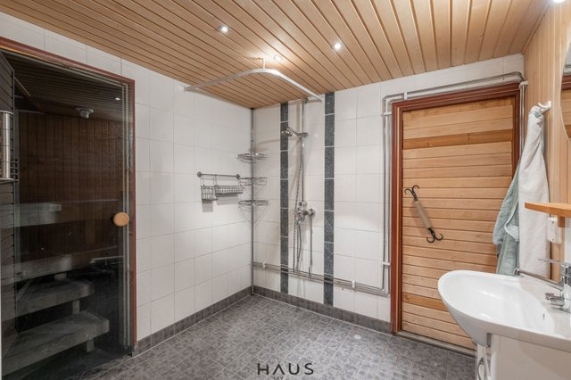- Suihku, peili, pesukoneliitäntä, pesuallas, allaskaappi, ja lattialämmitys