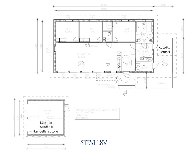 - Piirrustusten mukaan HUM= 119m2 (kerrosala on 135m2) ja autotallin kerrosala on 48m2.