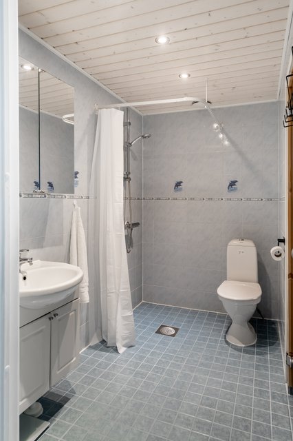 - WC-istuin, suihku, allaskaappi, pesuallas, ja peilikaappi