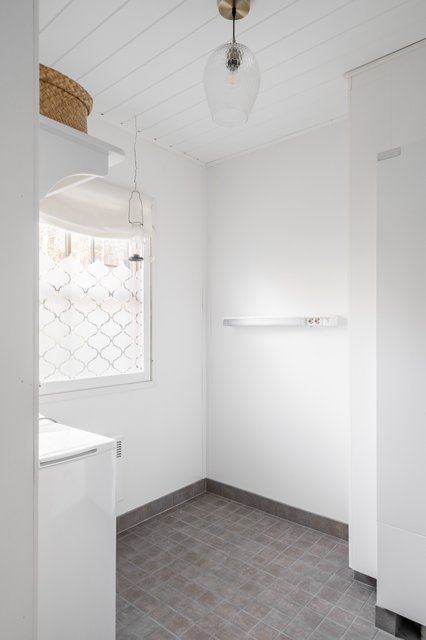 - Erillinen kodinhoitohuone jossa paikka pyykinpesukoneelle. Tilaan mahtuu myös hyvin kuivausrumpu sekä kaapistoja.