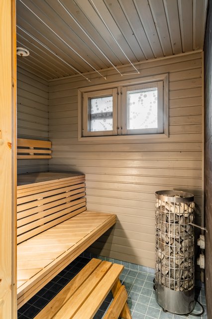 Alakerrassa avokeittiö, olohuone, kylpyhuone sauna sekä erillinen kodinhoitohuone.