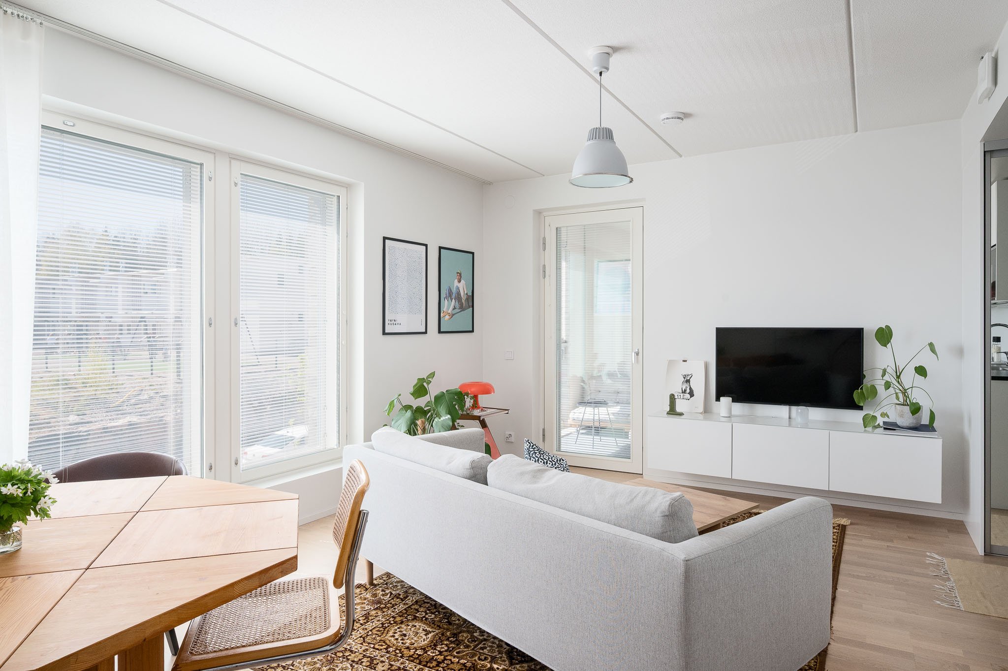 Tämän toisen kerroksen asunnon pohja on toimiva ja käytännöllinen. Valoisa olohuone yhdistyy hyvin vaaleasävyisen ja modernin avokeittiön kanssa. Olohuoneesta on kulku kompaktille lasitetulle parvekkeelle. Makuuhuone on sopivan kokoinen ja näkymät ovat parvekkeelle. Tyylikäs kylpyhuone on tilava ja pesukoneelle on oma paikka.