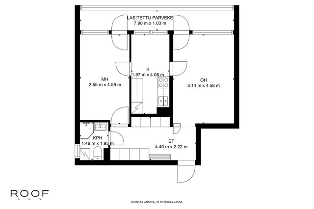 Tässä kodissa ihastuttaa loistava pohjaratkaisu, erillinen keittiö, isot ikkunat, vaaleus sekä koko asunnon levyinen lasitettu parveke. Keittiössä on tilaa ruokapöydälle. Nykyaikainen kylpyhuone. Eteisessä runsaasti kaappitilaa. Olohuoneesta ja makuuhuoneesta käynti lasitetulle parvekkeelle.