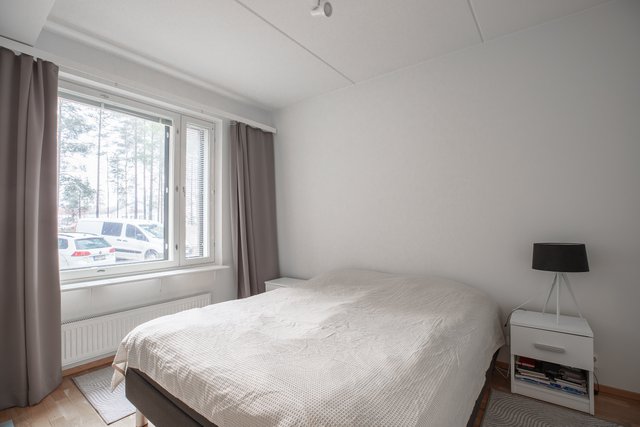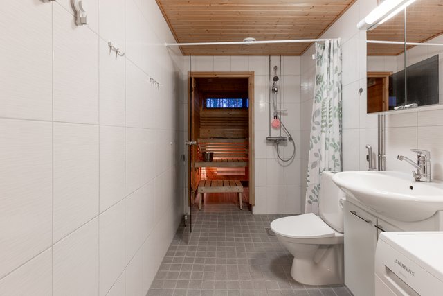 Kylpyhuone on moderni, ja siellä on valmius pesukoneelle. Oman saunan löylyissä rentoudut kiireisen päivän jälkeen. Makuuhuoneessa on kauniit parkettilattiat, jotka jatkuvat myös olohuoneeseen ja keittiöön.