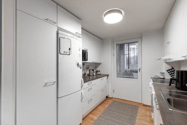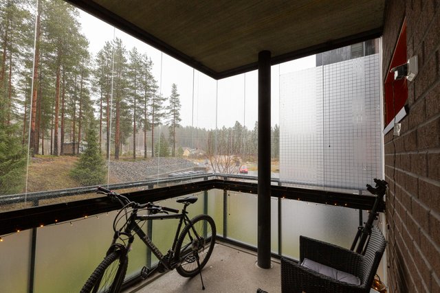 Asunnossa on tilava olohuone, joka yhdistyy käytännölliseen keittiöön. Keittiön varustelu, kuten jääkaappi-pakastin, uuni ja astianpesukone, tekevät arjen sujuvaksi. Parveke on lasitettu, ja se tarjoaa mukavan lisätilan rentoutumiseen.