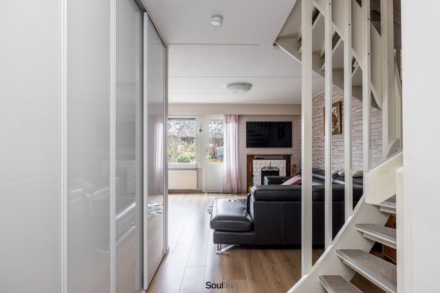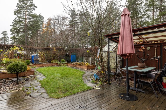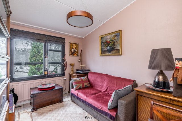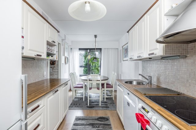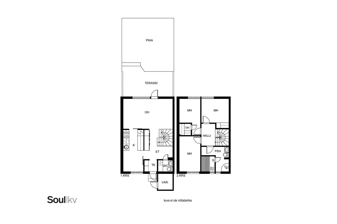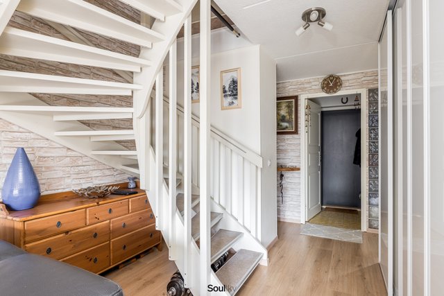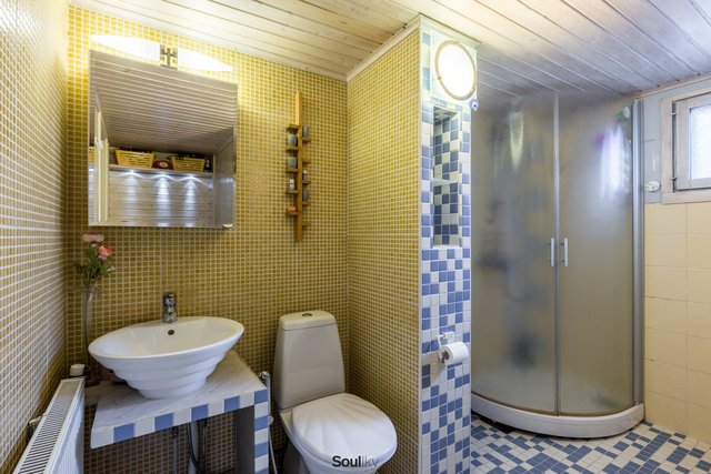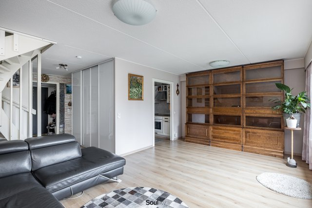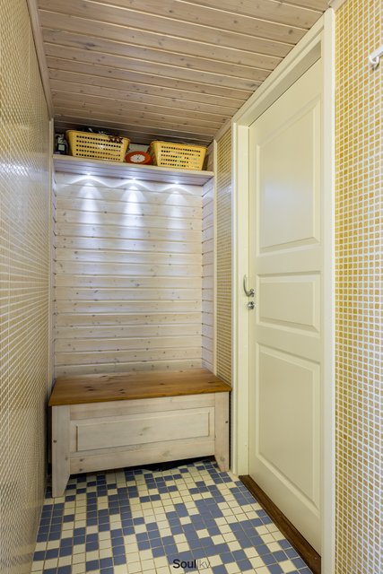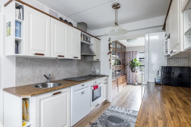 Keittiössä on ajattomat materiaalit sekä ruokapöydälle löytyy oma paikkansa ikkunan vierustalta. Lisäksi alakerrassa on erillinen wc. Yläkerrasta löytyy kolme makuuhuonetta, kylpyhuone, sauna sekä tilava vaatehuone. Asunnon sisäänkäynnin viereltä löytyy kylmä ulkovarasto.
