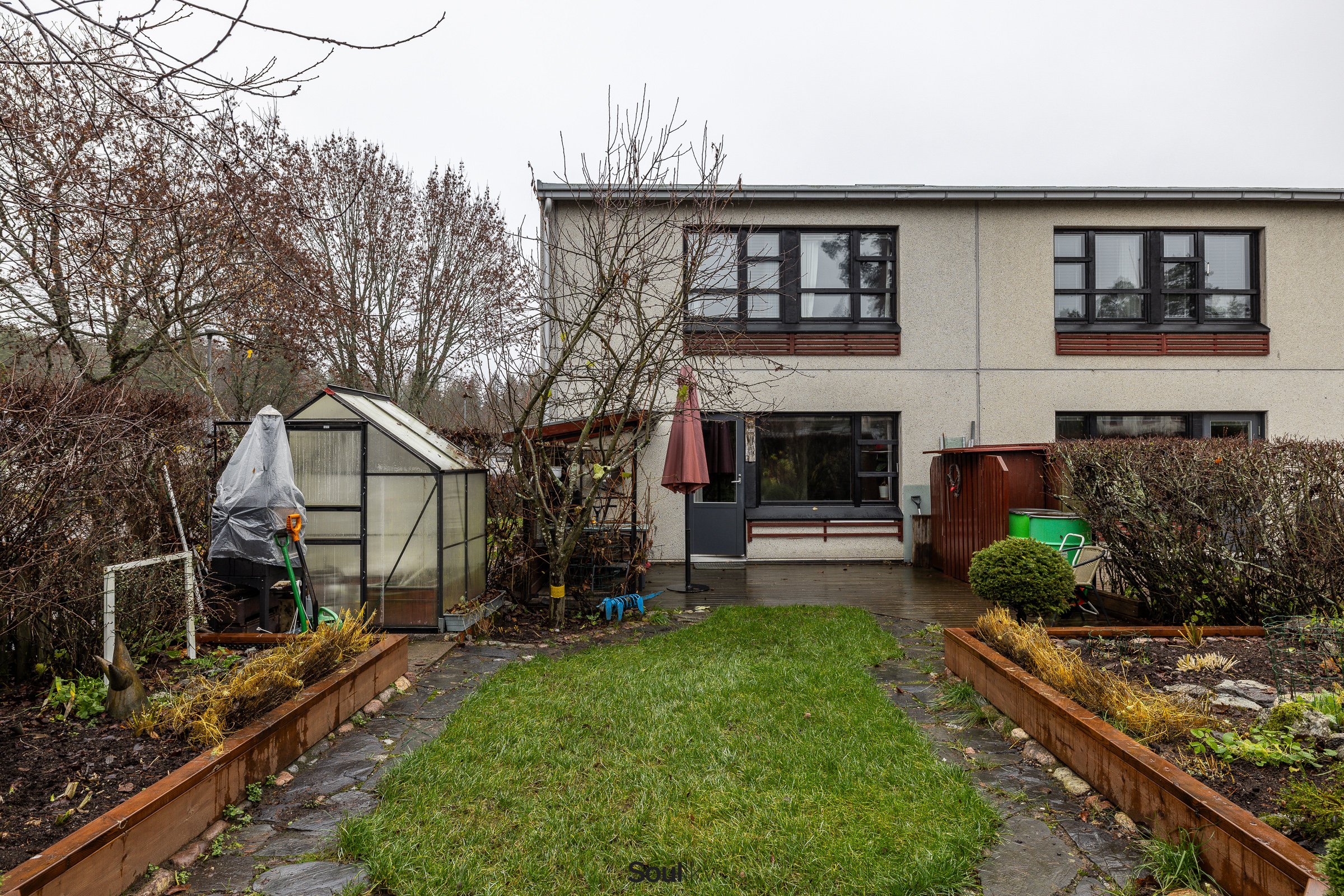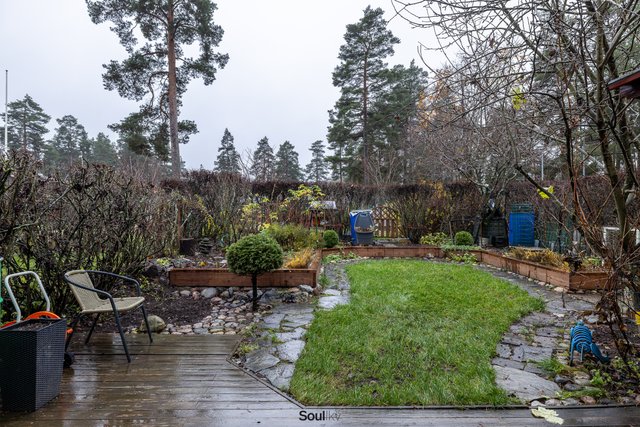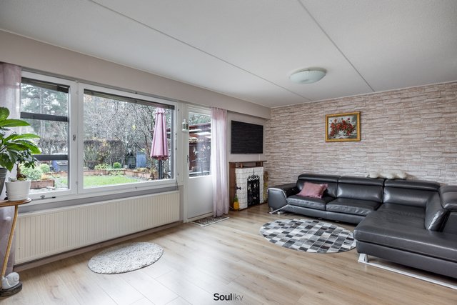 Tilavasta olohuoneesta avautuu käynti asunnon suurelle ja suojaisaille pihalle, joka on täydellinen paikka kesäpäivistä nauttimiseen. Pihalle on istutettu kirsikka- ja omenapuu sekä mustaherukka-, karviais- ja vadelmapensaat.