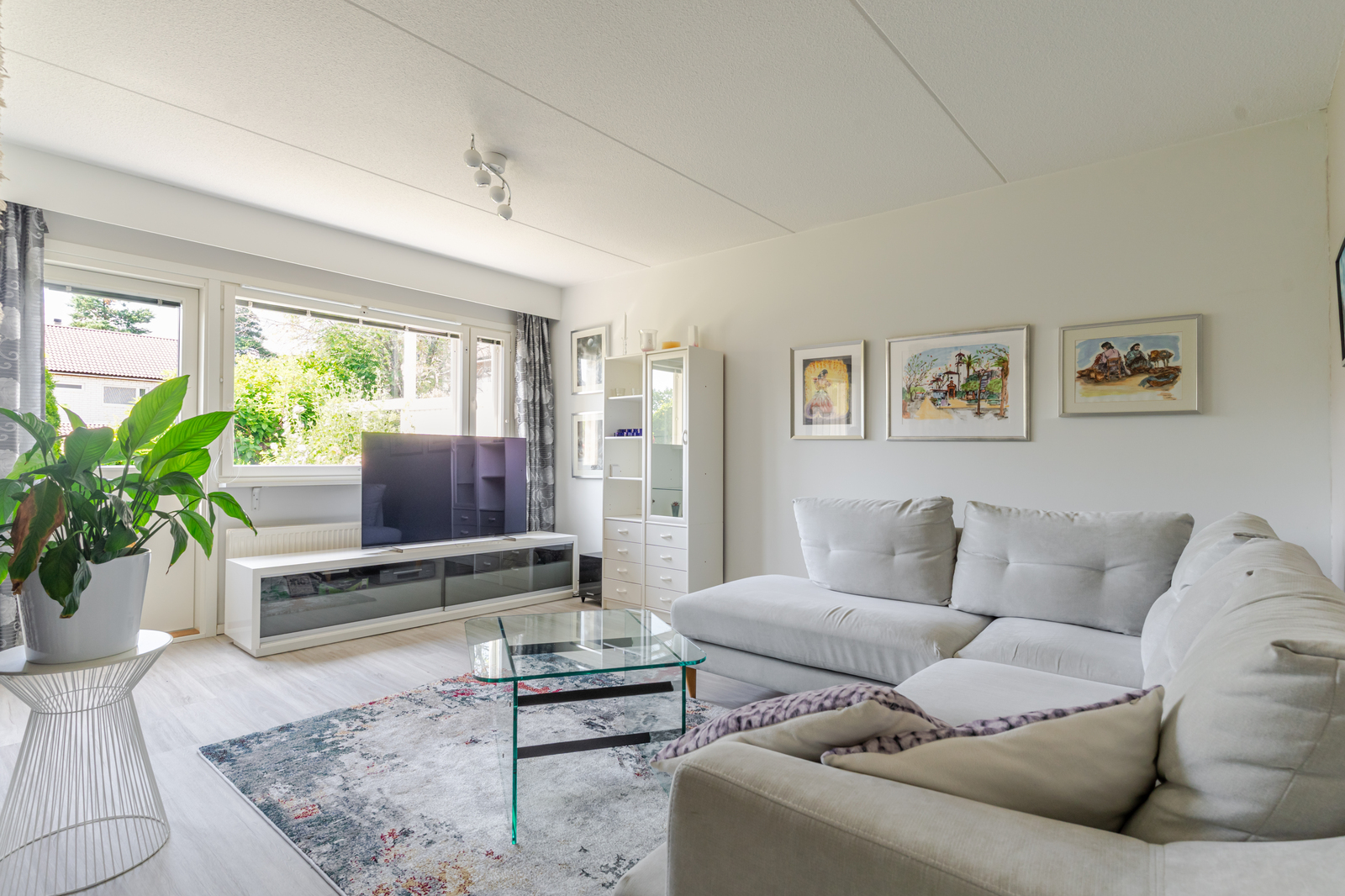 Tämä valoisa ja avara rivitalokoti hurmaa toimivalla pohjaratkaisullaan. Kodin sydän on keittiö, joka yhdistyy liukuvan seinän kautta olohuoneeseen luoden yhtenäisen ja viihtyisän tilan, kuitenkin palvellen suljettuna keittiötilana tarpeen vaatiessa. Olohuoneesta avautuu tuulensuojainen, yksityisyyttä tarjoava ja aurinkoinen aidattu piha, nurmikolla ja laatoitetulla terassilla – täydellinen paikka nauttia kesäpäivistä ja grillaushetkistä perheen tai ystävien kanssa.