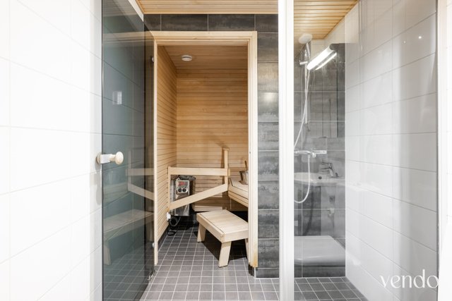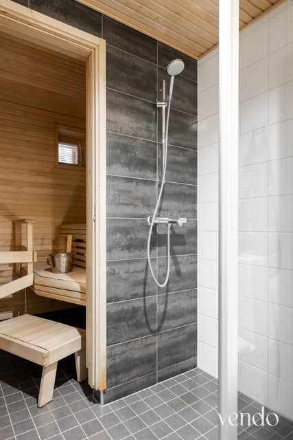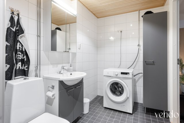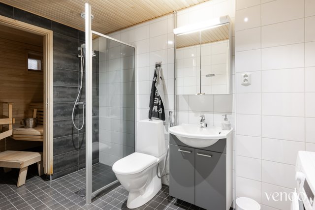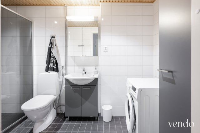 - WC-istuin, suihku, pesukoneliitäntä, lattialämmitys, peilikaappi, bidee-suihku, allaskaappi, suihkuseinä, ja pesuallas