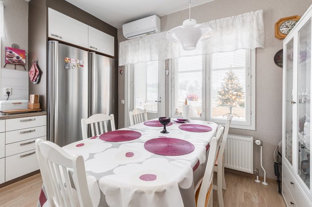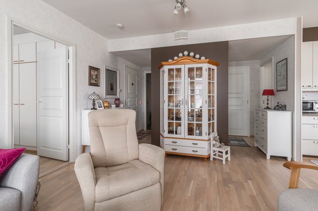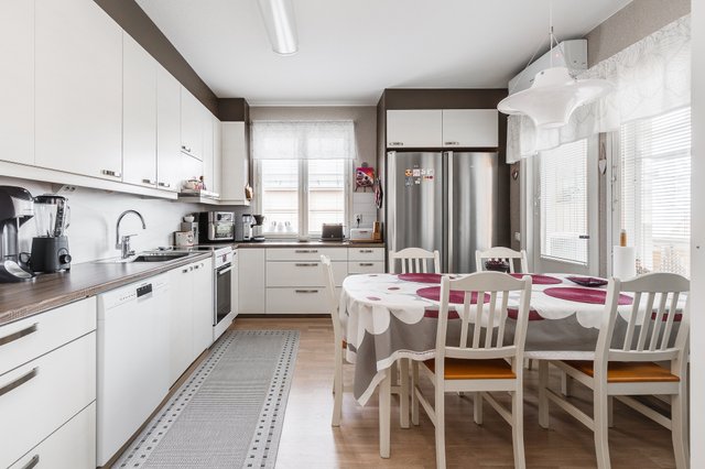 - Kaapistot, liesi, liesituuletin, astianpesukone, jääkaappi (uusittu 2024), pakastinkaappi (uusittu 2024), viilennyspumppu (asennettu 2020). Kaapistojen ovet, vetolaatikostot, liesi, liesituuletin, astianpesukone, tasot, allas, hana ja led-valaistus uusittu 2020. Keittiöstä käynti lasitetulle parvekkeelle.
