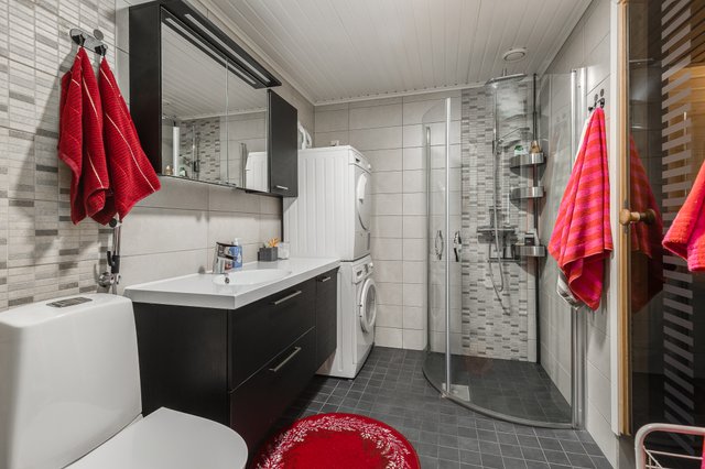 - Kylpyhuone/wc: wc-istuin, bidesuihku, allas, kaapistot, suihku, suihkuseinät 2 kpl, kuivauspatteri, pesukoneliitäntä, lattialämmitys (sähkö). Kylpyhuone/wc remontoitu ja samalla myös led-valaistus uusittu 2021.