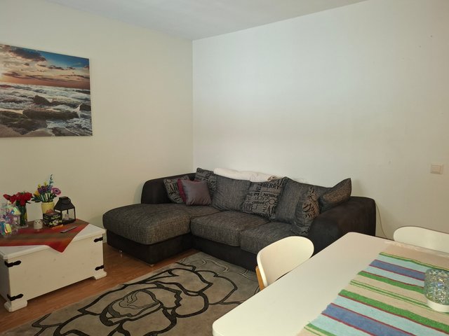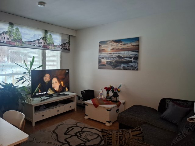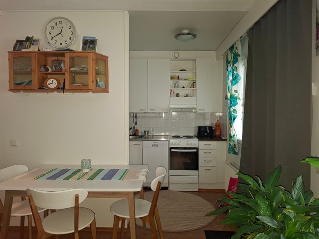 Asuntoon sisäänkäynti talon päädystä. Siisti tilava keittokomero ja olohuone etelän suuntaan, olohuoneesta käynti terassille.