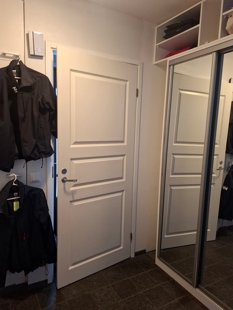 Myös eteisessä hyvin kaapistoja ja liukuovet peileillä tuo lisää tilantuntua.