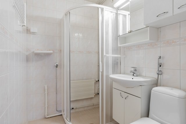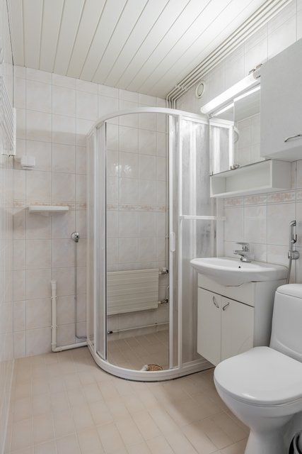 - WC-istuin, suihku, suihkukaappi, peilikaappi, pesuallas, allaskaappi, bidee-suihku, ja pesukoneliitäntä